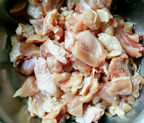 首先我們把所有食材清洗乾淨,然後將雞肉切成塊,再過冷水備用。