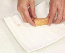 在空碗中打入一個雞蛋,攪拌成雞蛋液,加入麵粉和水調成糊狀。不能調的太稀,雞蛋麵粉糊剛剛能從筷子上流下來就可以。香蕉去掉皮,在切成段,撒上生粉備用。香蕉段的大小要根據雞肉片的大小來决定,不要超過雞肉片的大小。把醃好的雞肉,一片一片的放在案板上,再把香蕉段放在雞肉片上,用雞肉片把香蕉段給卷起來,做成肉卷。