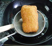 開火起鍋,鍋中加入少許油,油七成熱的時候把肉卷放入鍋中,用小火來慢慢炸。炸的時候要來回翻動肉卷,讓其均勻受熱,雞肉炸至金黃色的時候撈出,放入盤中放凉就可以開吃了。