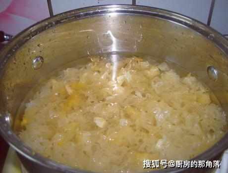 第四步,便可發現銀耳已經出膠質了,這個時候將雪梨放入在鍋中,繼續煮一會,過程中準備一小把枸杞,將其放入在溫水中浸泡一會;