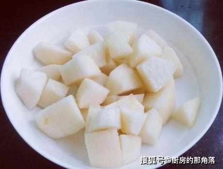 第三步,煮銀耳的過程中,雪梨一個,將其用食鹽搓洗乾淨後,去掉雪梨的核,將雪梨切成稍微小一點的塊,待將銀耳差不多煮了15分鐘的時間;