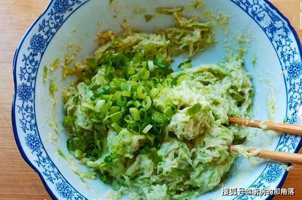 第三步:攪拌均勻後加入適量的麵粉,麵粉不可放入太多,否則炸出的丸子發硬,能够成丸子形狀就可以了。然後加入蔥花少許,放入適量的熟玉米油,攪拌均勻即可。加玉米油的目的使炸出的丸子更加酥脆,且凉了也不會硬。