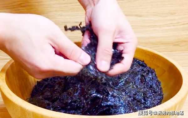 3.掰好的紫菜,我們在上面淋入少許的食用油。然後用手將其抓拌均勻,放在一旁備用。紫菜裏放上的食用油,這樣做出來的紫菜才不會發黑,而且也不會糊鍋。