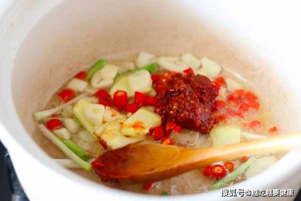 2、取出家裡的砂鍋,放入植物油,燒熱以後,放入蒜瓣還有香葱,接著放入薑片把它爆香,再放豆瓣醬1勺炒出紅油。