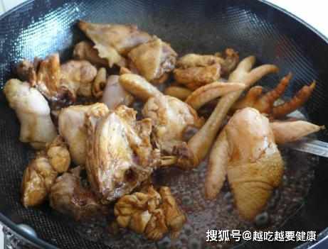 第四步,放入冰糖,同時加入3勺的花雕酒,翻炒一下,使得每一塊雞肉上都能粘鍋糖色,繼續將雞肉中的油脂煸出,然後放入生抽和醬油上色,在鍋中添上熱水,稍微沒過雞肉即可;