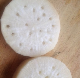 首先我們要準備新鮮的白蘿蔔,洗乾淨之後切成片,用工具把每一片蘿蔔皮都戳幾個洞,備用。