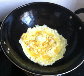 起鍋熱油,在油溫達到六七成熱的時候,將準備好的雞蛋倒入鍋中,在雞蛋快定型的時候用筷子攪碎,將攪碎的雞蛋盛出備用。