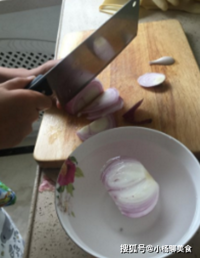 首先我們需要將洋葱切好。這裡大家可以提前把洋葱放在冰柜裏冷凍一下,或者是在刀上沾些水,這樣切洋葱的時候就不會辣眼睛。
