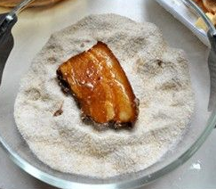 在碗中倒入鹽、料酒、白糖、五香粉、白辣椒粉,攪拌均勻。然後塗抹在肉塊上,再用錫紙包住,放入烤箱中,烤至其露出的表皮呈焦黃色,即可出箱撒上適量鹽,放烤架上烤20分鐘,然後放凉,蘸取適量的芥末即可食用(蘸料根據個人喜好而定)。