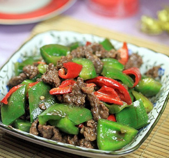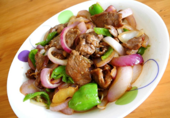 起鍋倒油,油熱後爆香薑蒜,然後放入醃制好的牛肉翻炒,變色後,放入青紅椒塊,再倒入生抽、少許醬油、雞粉、葱段再次翻炒幾分鐘即可出鍋食用。
