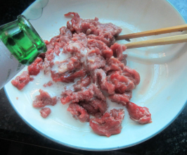 在碗中放入適量的料酒、鹽、黑胡椒粉、食用油攪拌均勻備用。在另一個碗中放入適量的麵粉,然後倒入啤酒,攪拌一下,然後將切好的牛肉片放入碗中裹好,再拿到調料碗中醃制20分鐘。