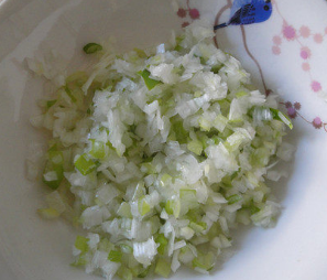 做法:取一乾淨的盆,把麵粉放入盆中,加入開水用筷子攪拌成面絮,再倒入冷水,用手和成麵團。在盆上蓋上兩層保鮮膜,讓麵團發酵半個小時左右。把葱清洗乾淨,取葱葉部分切成葱末。在空碗中放入猪油、鹽、五香粉攪拌均勻,做成料汁。