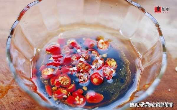 步驟2,拿出1個小玻璃碗,放入小米椒段,倒入1勺蚝油、1勺醬油、半勺玉米油、2勺米酒汁,用勺子攪拌均勻。