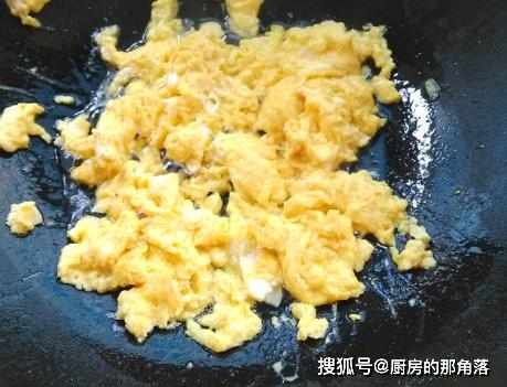 第二步,雞蛋磕入在碗中,加上一點點食鹽,打散成液,炒鍋中添上少許的食用油,燒熱後淋入雞蛋液,將其劃散炒熟後盛出晾凉;