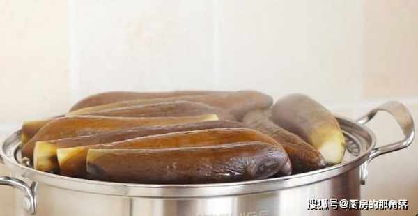 3.蒸鍋中加入適量清水大火燒開,水開後我們將晾好的茄子放在上面上鍋蒸至15分鐘。15分鐘後我們發現這時的茄子已經蒸制好了。