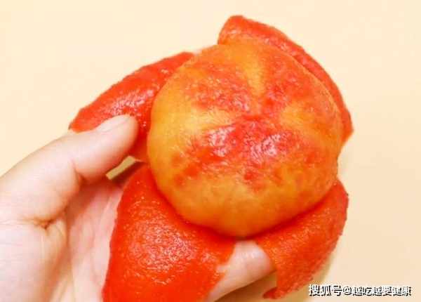 3.我們可以順著這個十字,將蕃茄外皮慢慢地剝掉,用這個方法剝的蕃茄,蕃茄外皮很容易就下來了。剝下來的蕃茄外皮,粘連著很少的果肉,而且果肉包的也特別完整,湯汁也不會流在手上。是不是特別簡單呢?