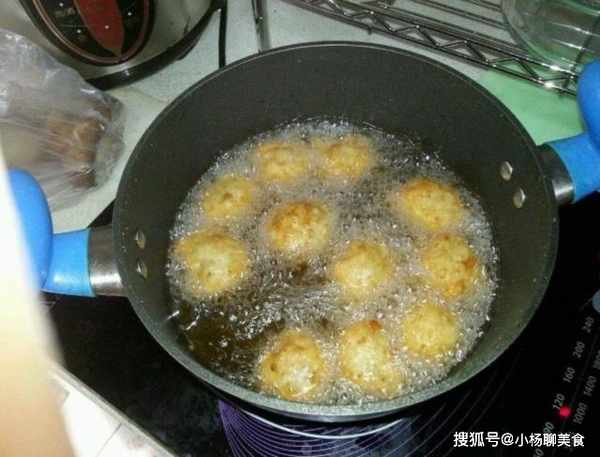 第三步,鍋中燒熱油,油溫達到7成熱時,將肉泥一個個弄成丸子的形狀下鍋油炸。炸至表面金黃酥脆撈出,想要更酥脆一點,那就下鍋複炸一遍。