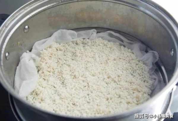 第二步,將糯米洗乾淨,上鍋蒸熟,大概蒸20分鐘就可以了。然後將蒸熟的糯米取出來,攤開晾凉,然後用勺子壓成泥,加入肉泥中攪拌均勻。