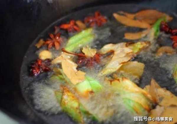 3、鍋中燒熱油,加入葱段、八角、香葉和花椒炸出香味,然後撈出各種香料,過濾出香油。