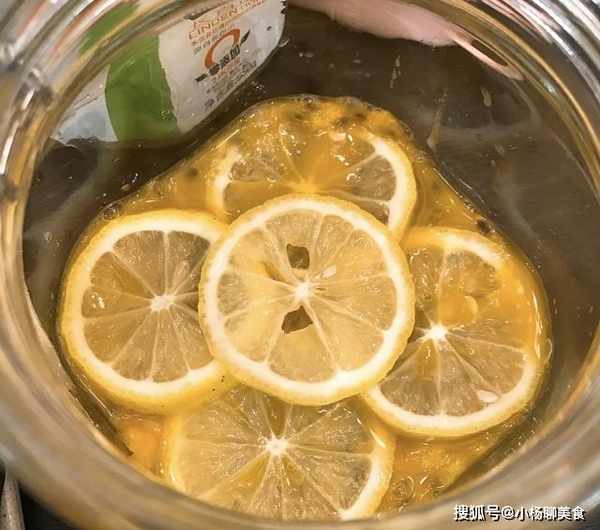 3、百香果肉放一層,再放入幾片檸檬,倒入少許蜂蜜,接著重複這個動作幾片,放滿罐子。
