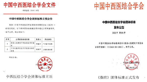 2021年8月11日,中國中西醫結合學會準予發佈《急性心肌梗死中西醫結合診療指南》(T/CAIM 001-2021)團體標準。團體標準的發佈標誌著《指南》不僅得到國內西醫、中醫及中西醫結合學者的肯定,而且得到中西醫結合標準化工作的認可。
