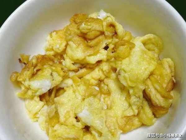 步驟三:起鍋熱油,油熟後倒入雞蛋液,翻炒到雞蛋液成型變熟,搗散盛出備用。
