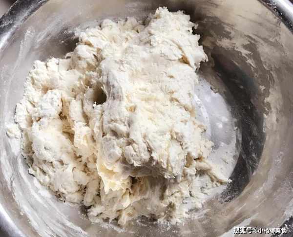 步驟五:另準備一個乾淨的盆子,倒入適量麵粉和清水,攪成絮狀,倒在面板上面,揉成麵團。