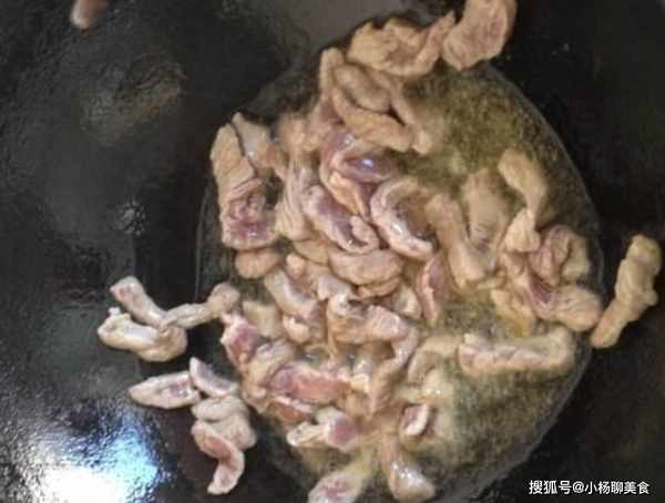 步驟三:起鍋熱油,油熟後放入葱絲和蒜片,煸炒出香味,然後倒入猪肉,翻炒到猪肉變色。