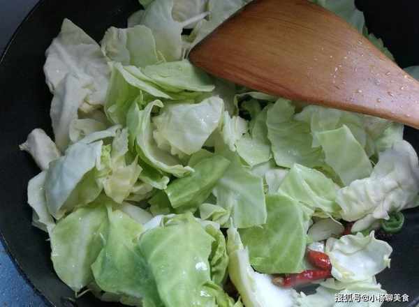 步驟三:繼續倒入包菜炒勻,倒入一點點清水,大火翻炒到包菜變軟變熟。