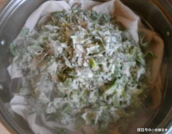 步驟四:蒸籠內鋪一層籠布,把裹有麵粉的芹菜葉倒在蒸籠內。