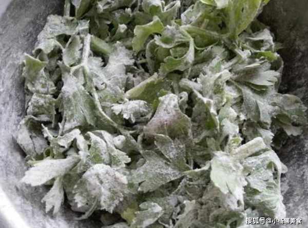 步驟三:然後倒入麵粉,一邊倒一邊攪拌,直到每個芹菜葉均勻的包裹上麵粉。