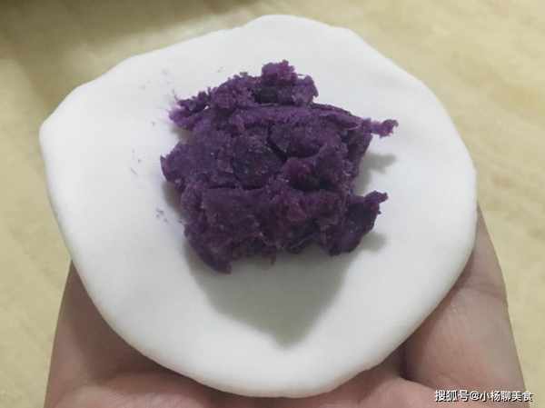 步驟六:取適量紫薯餡放在圓皮中間,捏合收口,從手心中滾成圓球,然後放入幹木薯粉中滾一圈。