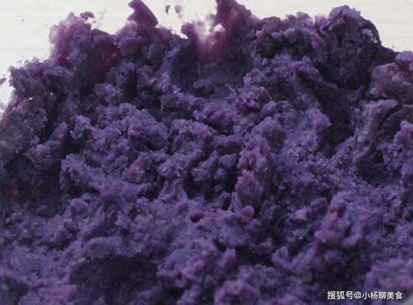 步驟三:取出蒸熟的紫薯,稍微晾凉,撕掉外皮,搗成紫薯泥。