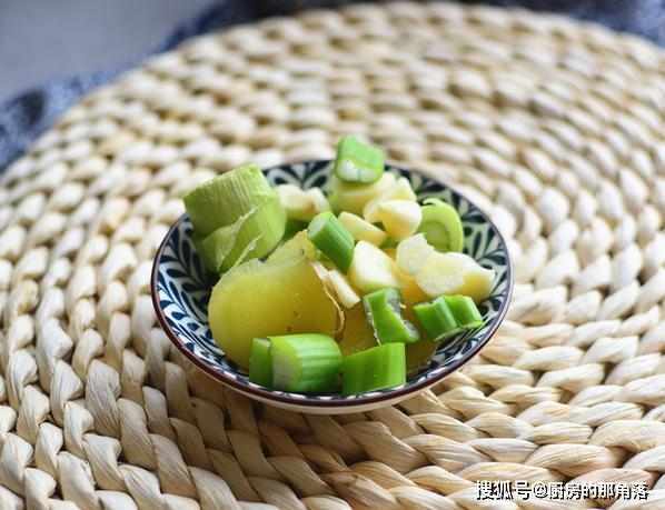 第二步,大葱剝去幹皮切成段,生薑切成片,大蒜剝皮切成片