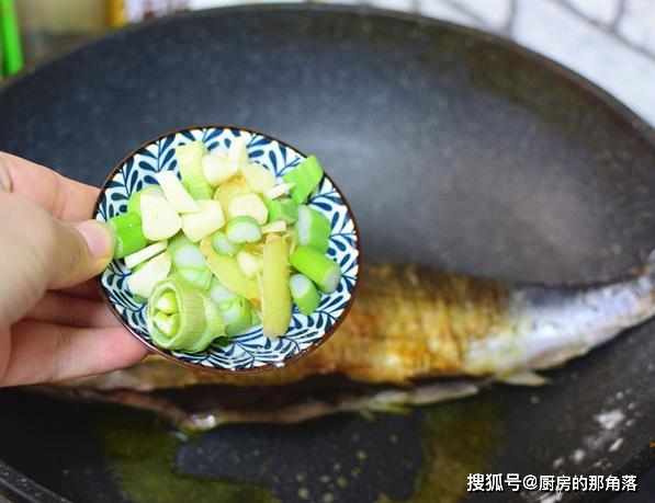 第四步,煎至魚的兩面呈現金黃色澤的時候,將切好的葱薑蒜放進去,爆香