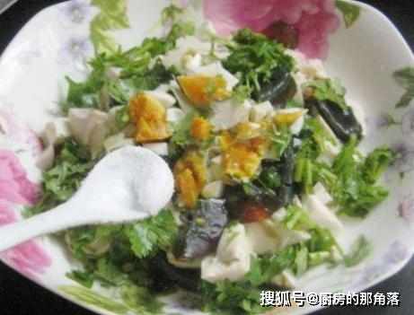 第六步,將切好的豆腐塊,連同皮蛋丁、鹹鴨蛋丁、香菜等,一起放在一個盆子中;