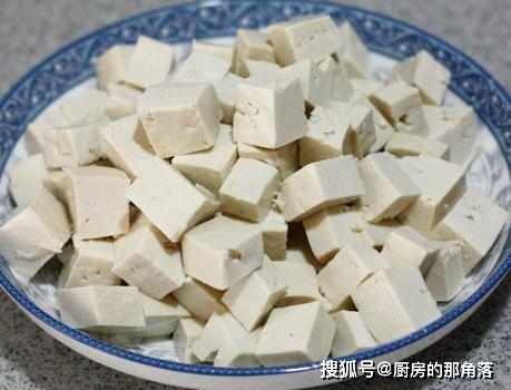 第二步,鍋中添上水,待水煮開後,加上些許的食鹽,將整塊豆腐放入,燙一下,取出後,切成小塊;