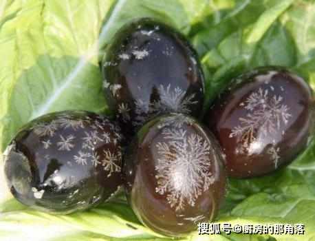 第四步,皮蛋剝去大頭的殼和泥後,將小的一頭敲一個小孔,往小孔內吹氣,即可將皮剝掉,剝掉皮後,清洗乾淨,切成丁;