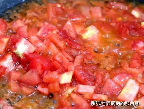 第四步,在炒锅中添上适量的食用油,待油烧热后,放入蒜末爆炒出其中的香味,然后将番茄块放入锅中,小火翻炒更易出水,一边翻炒番茄,一边用锅铲按压,直到番茄半软并且出水的时候;
