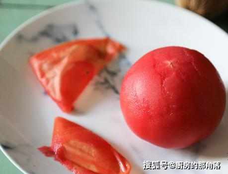 3、番茄最好事先去皮,吃着口感会更好,去皮的时候,将其放入开水锅中或者是烧沸的水中浸泡都可以,这样便可轻松去皮;