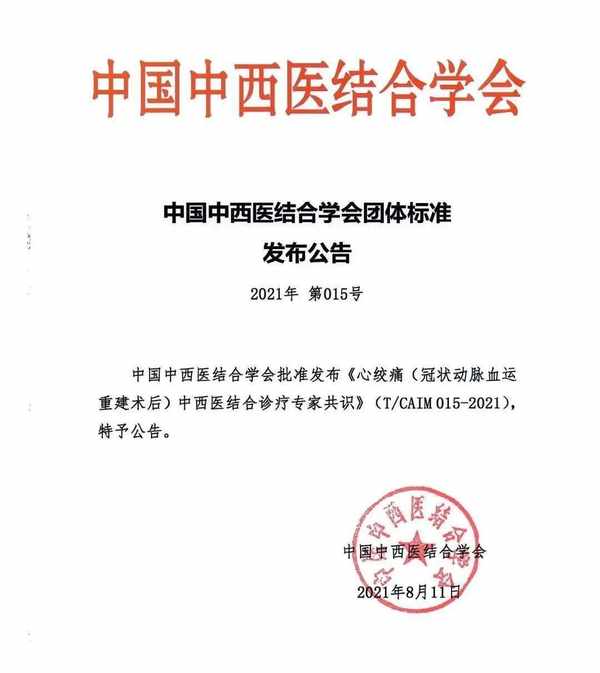 国家中医心血管病临床医学研究中心(中国中医科学院西苑医院)陈可冀院士团队、国家中医心血管病临床医学研究中心广东分中心(广东省中医院)陈秋雄教授团队共同起草的 《心绞痛(冠状动脉血运重建术后)中西医结合诊疗专家共识》团体标准(编号TCAIM 015-2021)在全国团体标准信息平台、中国中西医结合学会正式发布!