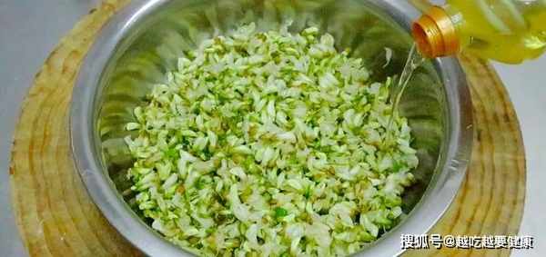 3.槐花晾乾水分後將其倒入一個大盆中,然後在裡面加入半勺食用油。均勻的裹勻這個槐花葉,這是防止槐花粘連在一起的第二個技巧啦!