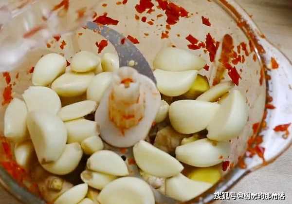 2.晾辣椒的時候,將一斤半的大蒜剝掉外皮。然後將其放在料理機中打碎,沒有料理機的用刀拍散切碎也可以。老薑半斤將其放在料理機中,打碎備用。