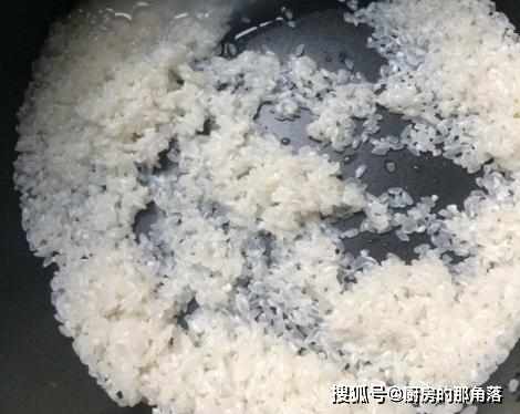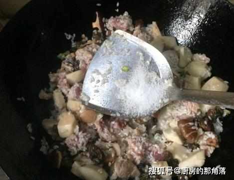 第四步,再倒入瘦肉和杏鮑菇繼續翻炒,接著再加上清洗乾淨的大米,翻炒均勻後;