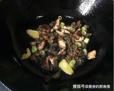 第三步,鍋中放上適量的油,燒熱後,放入葱薑爆香,再倒入提前泡發並且清洗乾淨的幹香菇和蚝幹翻炒;