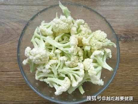 第一步,首先將菜花放在淡鹽水中浸泡一會,撈出來後,用手掰成小朵,瀝幹水分;