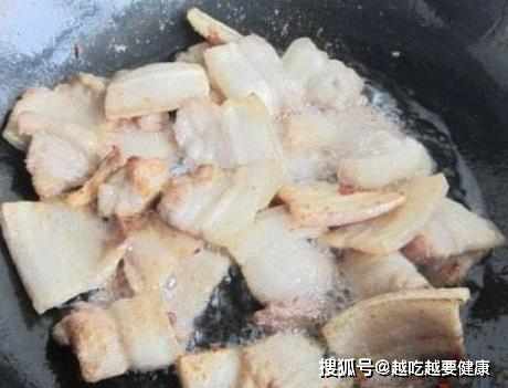 第四步,鍋中添上油,放入五花肉,開始煸炒,待五花肉翻炒至變色並且出油的時候,放入葱薑蒜、幹辣椒和豆豉;