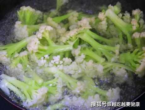 第二步,鍋中添上水,加上些許的植物油,待水煮開後,放入菜花,焯燙一下,即可撈出,瀝幹水分;