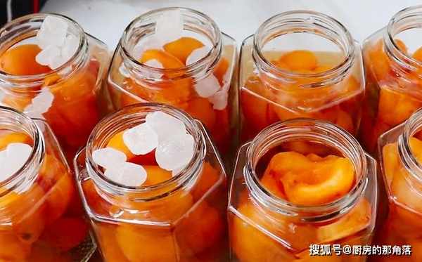 4.準備六個無油無水的玻璃罐,將清洗好的黃桃放入裡面,然後再放上一小把冰糖,將6個玻璃罐都裝滿,然後再加入適量的溫水沒過黃杏,不要加得太滿,加至三分之二處就可以了。然後再蓋上蓋子,不要擰得太緊。