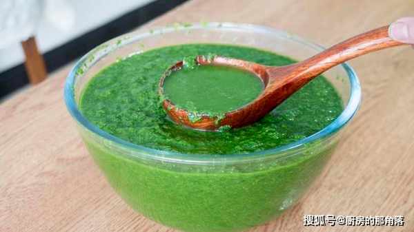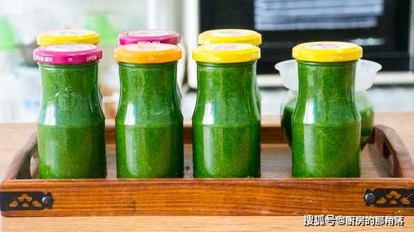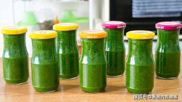 5、喜歡更細膩的一點可以用濾網再過濾一遍,我打得不是很細,也就沒有過濾,過濾後基本就只有艾草汁了,做食物顏色會更均勻好看,但香味兒肯定是會稍微的差一點,接著就可以用罐子裝起來了,這些玻璃罐我都提前清洗乾淨並消毒了,用勺子直接把艾草泥裝起來就可以了;